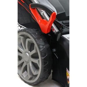 W kosiarce zastosowano koła o dużych średnicach, ułatwiające przetaczanie maszyny i jej ruch w cięższych warunkach.