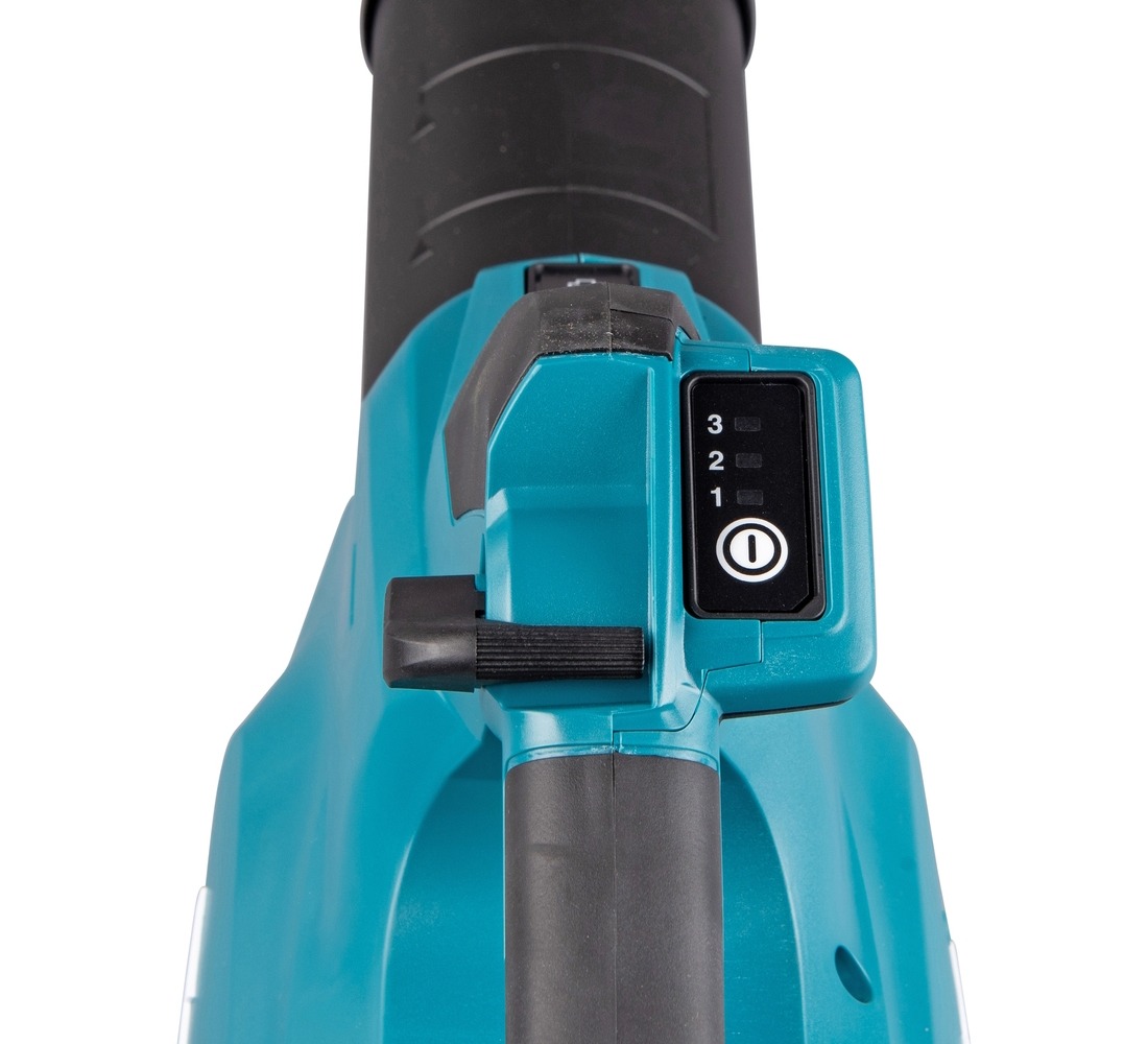 Elektroniczna 3 stopniowa kontrola prędkości obrotowej oraz płynna regulacja prędkości spustem włącznika na każdym biegu. Dźwignia pozwala na zablokowanie spustu na pożądanym poziomie mocy. Siła wydmuchu na biegu 3 wynosi maksymalnie 24 N. Wysoka odporność na wodę – IPX4.